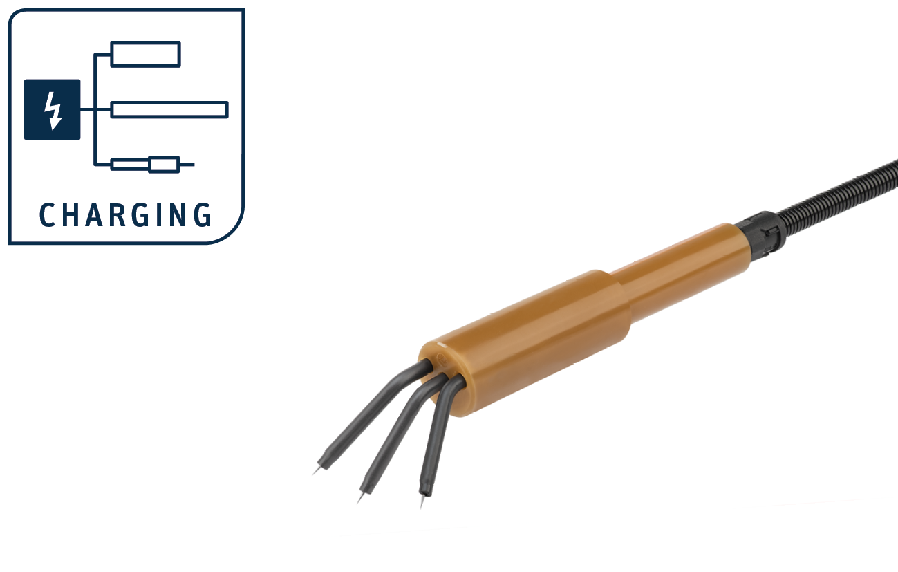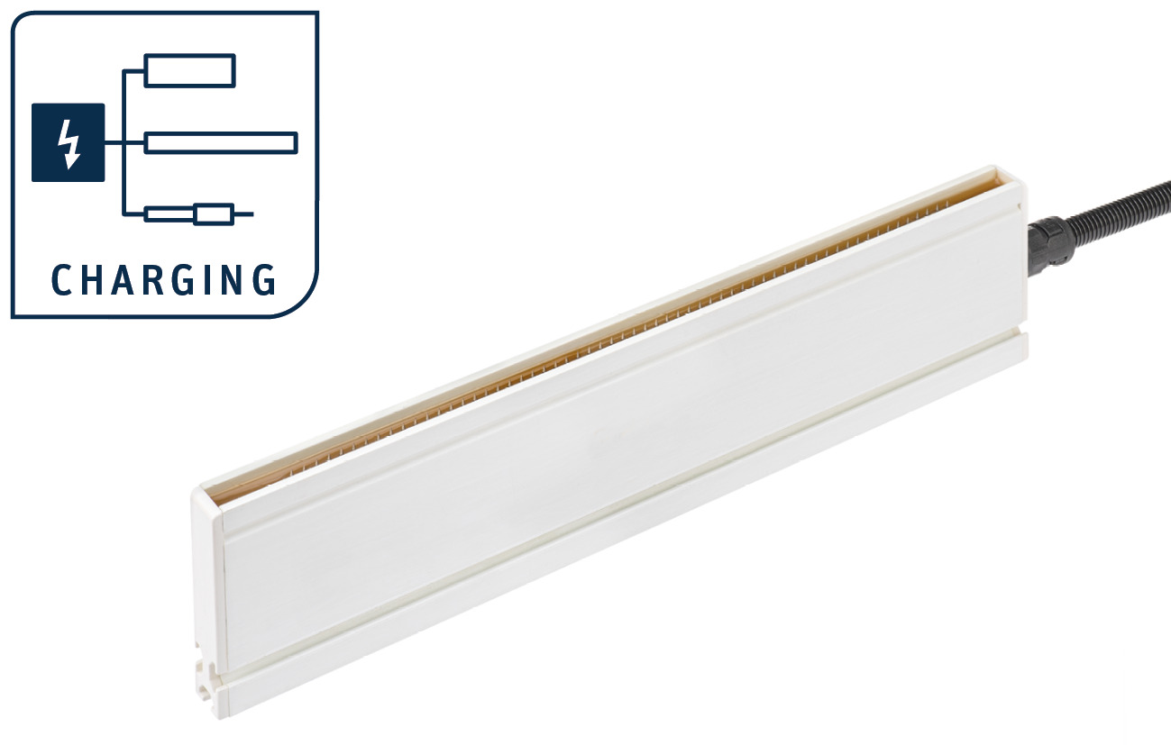 The charging bars transfer the generated static charge to the product. Depending on the material to be charged and the installation situation, different types of bars are used: R130 for working widths of up to 4 metres, R120 for narrow spaces and the R23ATR for precise charging of small surfaces.